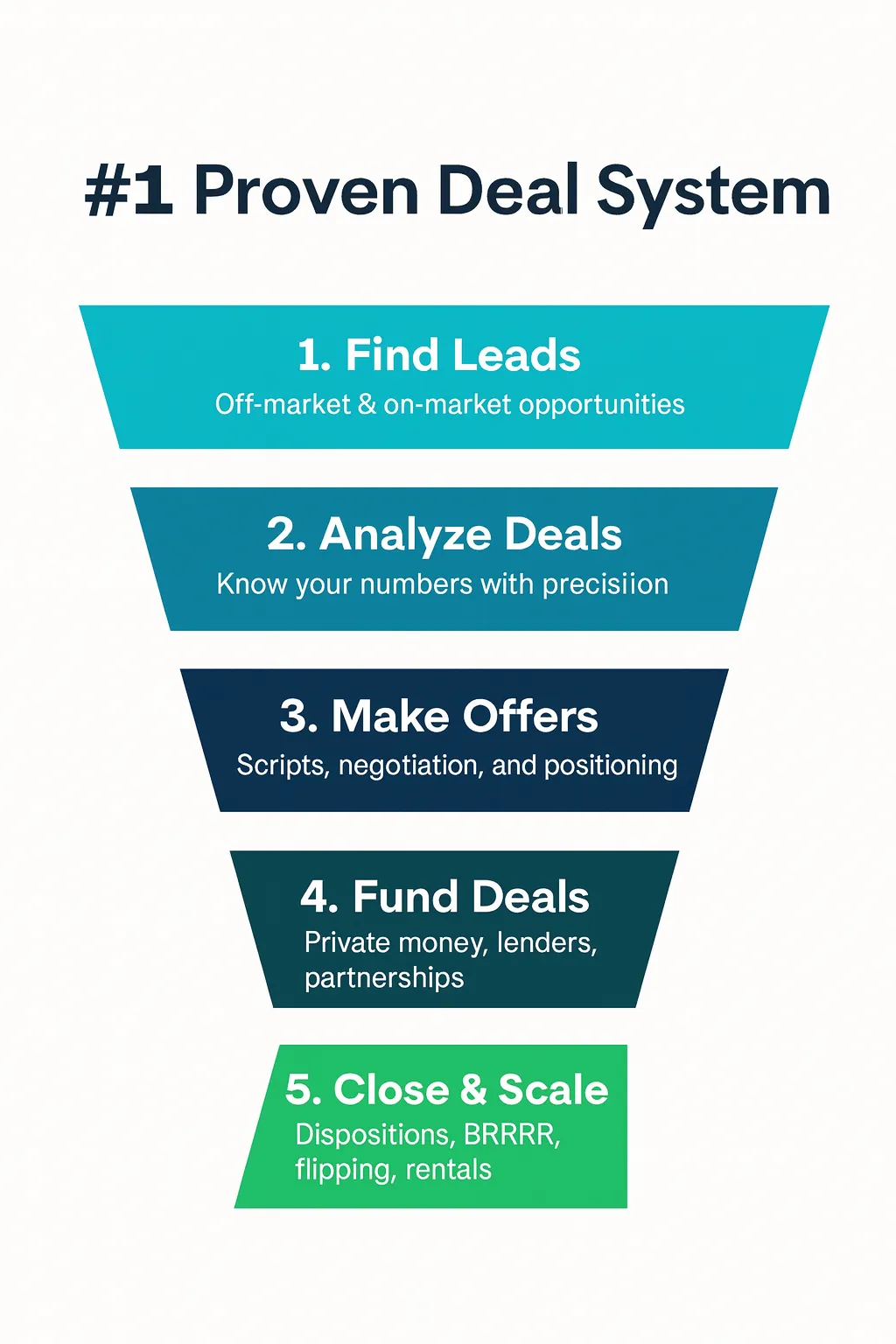Step-by-step frameworks to find, analyze, fund, and close profitable deals across multiple strategies—wholesaling, fix & flip, BRRRR, and rentals.
